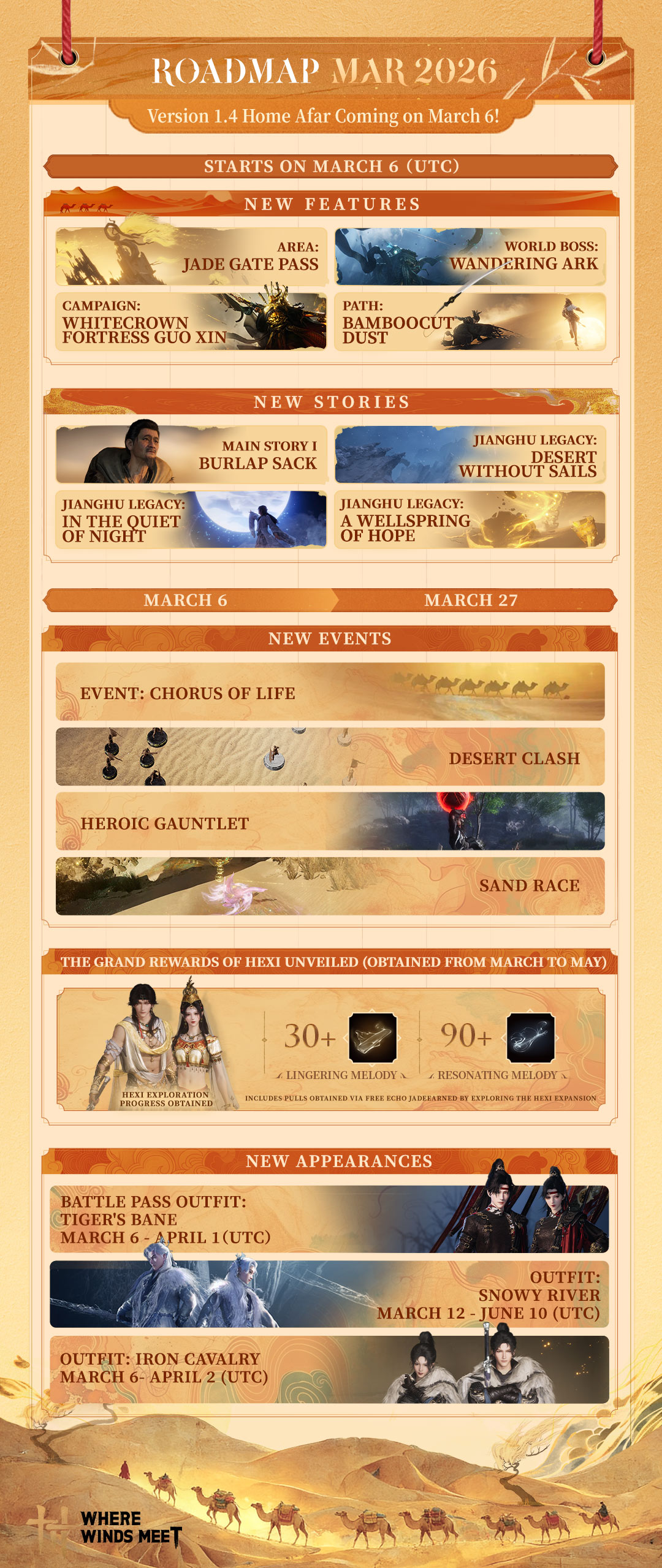 GUANGZHOU, China – (Feb 27th, 2026) – Where Winds Meet is proud to unveil the game’s first major expansion, “Hexi”. The new expansion will be free-to-play on PC, PlayStation and mobile. It consists of three major chapters, with chapter 1: Jade Gate Pass launching on Mar 6th, bringing a mesmerizing desert area, brand-new narratives, bosses, as well as fresh gameplay features and martial art styles to the Jianghu.